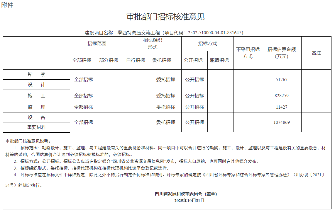 報來《關于呈批核準攀西特高壓交流工程的請示》(川電發(fā)展〔2025〕181號)收悉。經(jīng)研究,現(xiàn)將攀西特高壓交流工程(項目代碼:2502-510000-04-01-486846)核準事項批復如下: