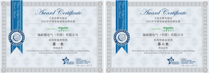 憑借在建筑領(lǐng)域的領(lǐng)先技術(shù)和綜合成果,施耐德電氣獲得了廣泛市場認(rèn)可,在千家品牌實驗室主辦的年度評選中,連續(xù)第六年榮獲“2025年十大智能照明品牌第一名”,并且還斬獲“2025年度十大建筑能源管理第三名”及“2025年樓宇自控領(lǐng)先品牌獎”等多項榮譽。值得一提的是,施耐德電氣還在今年首次入選了“智能家居品牌第六名”,實現(xiàn)了全新突破。